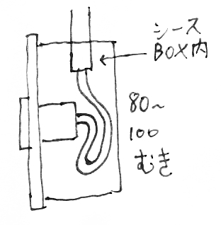 下図の金属性のJBOXもあります.このJBOXは大きさが100x100mmです.その中に上手に収まるようにするには下図の長さに剥くのがオススメです.
