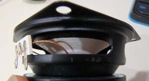 ↓コーンは金属にフィルムがラミネートされた風合いに見えます.コーン直径は約5cm.コーンを指で押した感触では、小型ながらストロークは大き目で、ダンパーは柔らか目です.