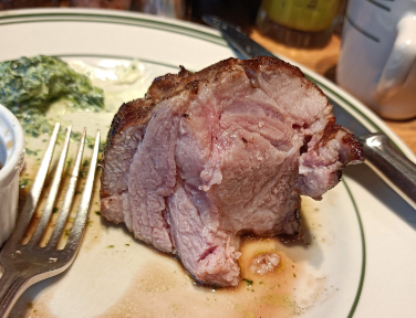 肉の断面はこんな感じ.恐らく、仕込み段階で低温調理してるんじゃないかな? それじゃないとたった数分の調理時間でこんな厚みのある肉の中まで均等に火は通らないと思うため.お客に提供する時点での調理はフライパンで焼き目をつけてるだけという印象だった.