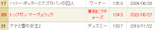 ↓ランキングの少し下を見ると、TOPGUNがまだ上映中です.TOPGUNの最終興収について最後に言及したのは2022年8月11日の当ブログで、140と予想しました.140の手前で終映になりそうですが、ほぼ予想通りの展開かと思います.