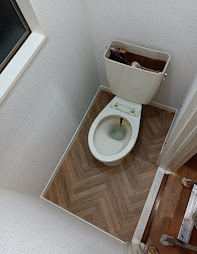 ↓CF貼りはいつも失敗します。便器の不定形に沿ってチマチマ切ってゆくのですが、綺麗に切れなくていつも失敗します。しかもトイレは狭い。便器に抱きつく様な姿勢で作業します。↓失敗箇所は茶色のジョイントコークで補修