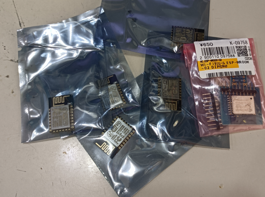 ↓いきなりプギャーっとなっちゃったのがこれ.秋月のWROOM-02とESP-12が5ヶ発掘されました.上のaitendo基板はESP-12を載せるためだったに違いない.なんでこんなの持ってるのかな? 記憶にないわー.無線moduleです.